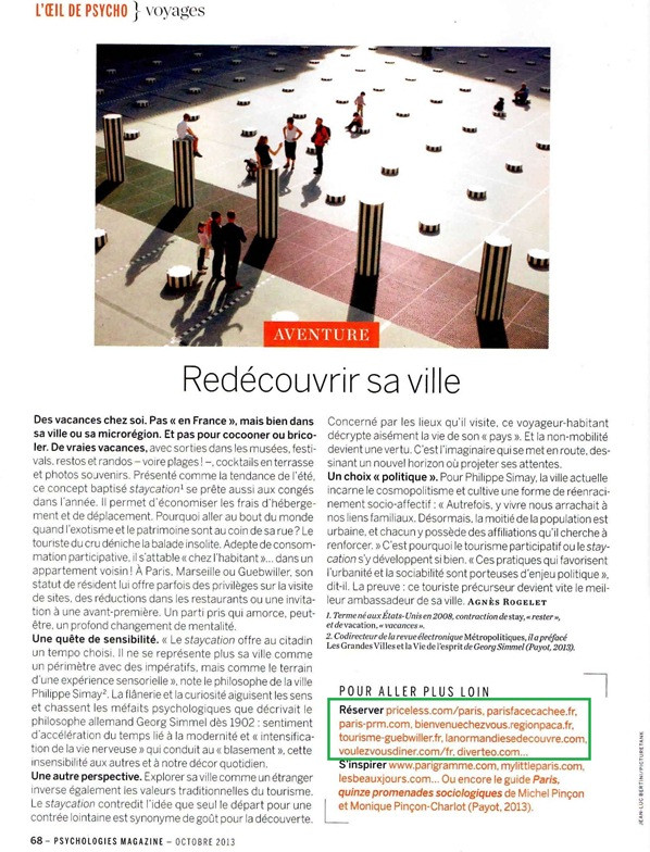 Le magazine Psychologies analyse le concept de staycation (contraction de stay « rester » et de vacation « vacances ») : une autre façon de (re)découvrir sa ville.